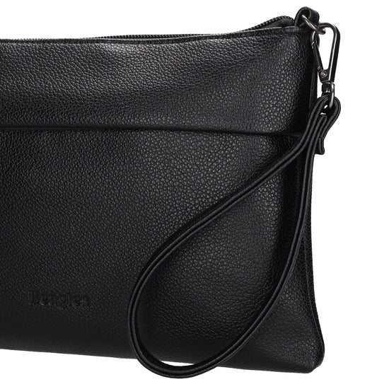 Diese kompakte Clutch in elegantem Schwarz ist der perfekte Begleiter für jeden Anlass – ob im Alltag oder beim Ausgehen am Abend. Gefertigt aus hochwertigem Kunstleder mit silberfarbenen Details, überzeugt sie mit einem modernen Look und vielseitiger Funktion.
