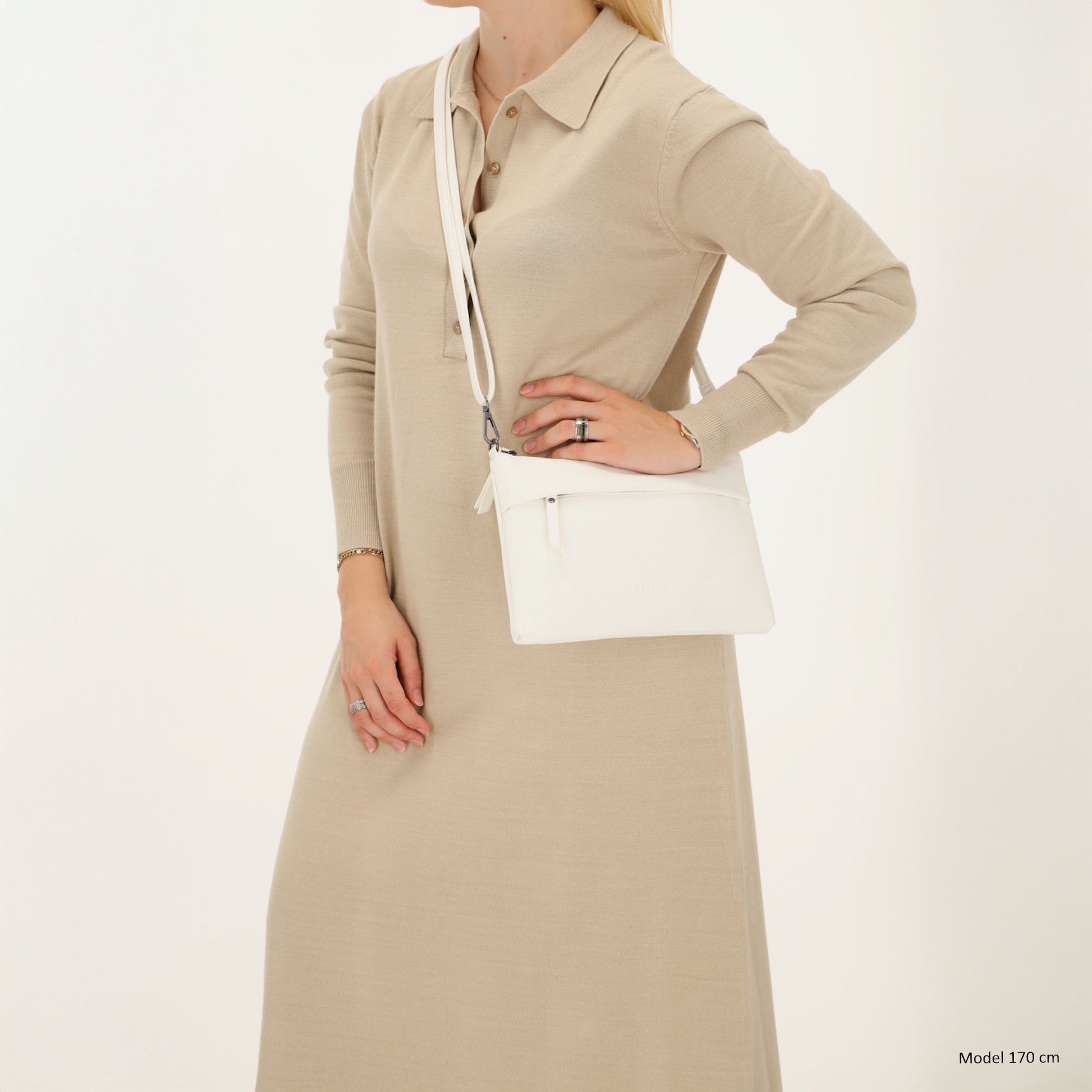 Diese weiße Clutch überzeugt mit modernem Design, kompaktem Format und funktionalen Details. Ob tagsüber in der Stadt oder abends beim Ausgehen – die Tasche passt sich deinem Look mühelos an.