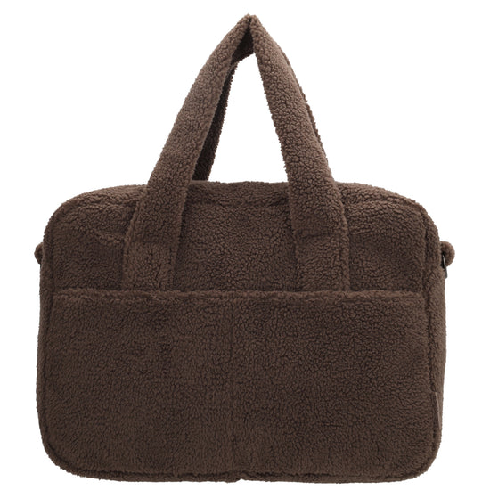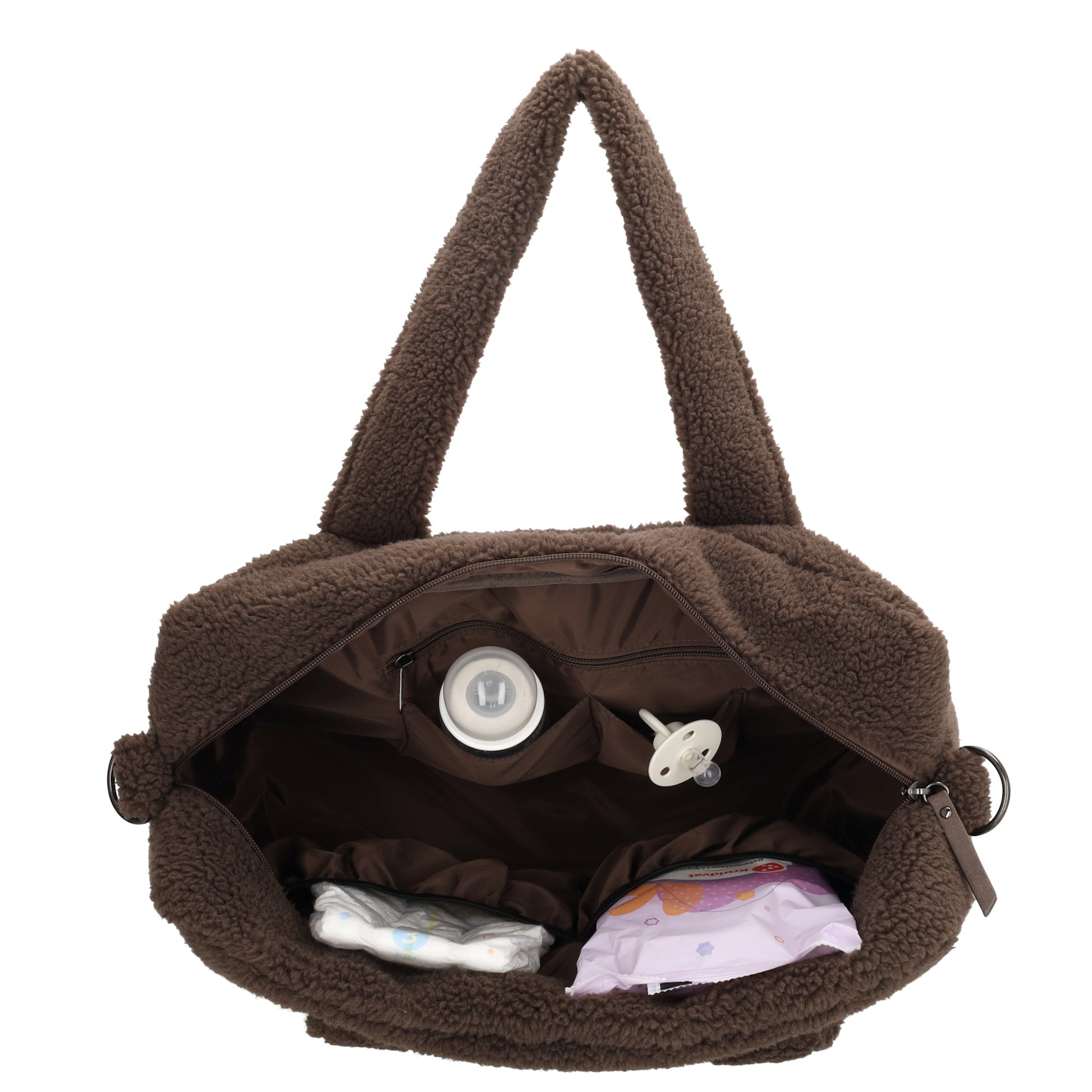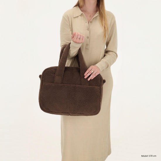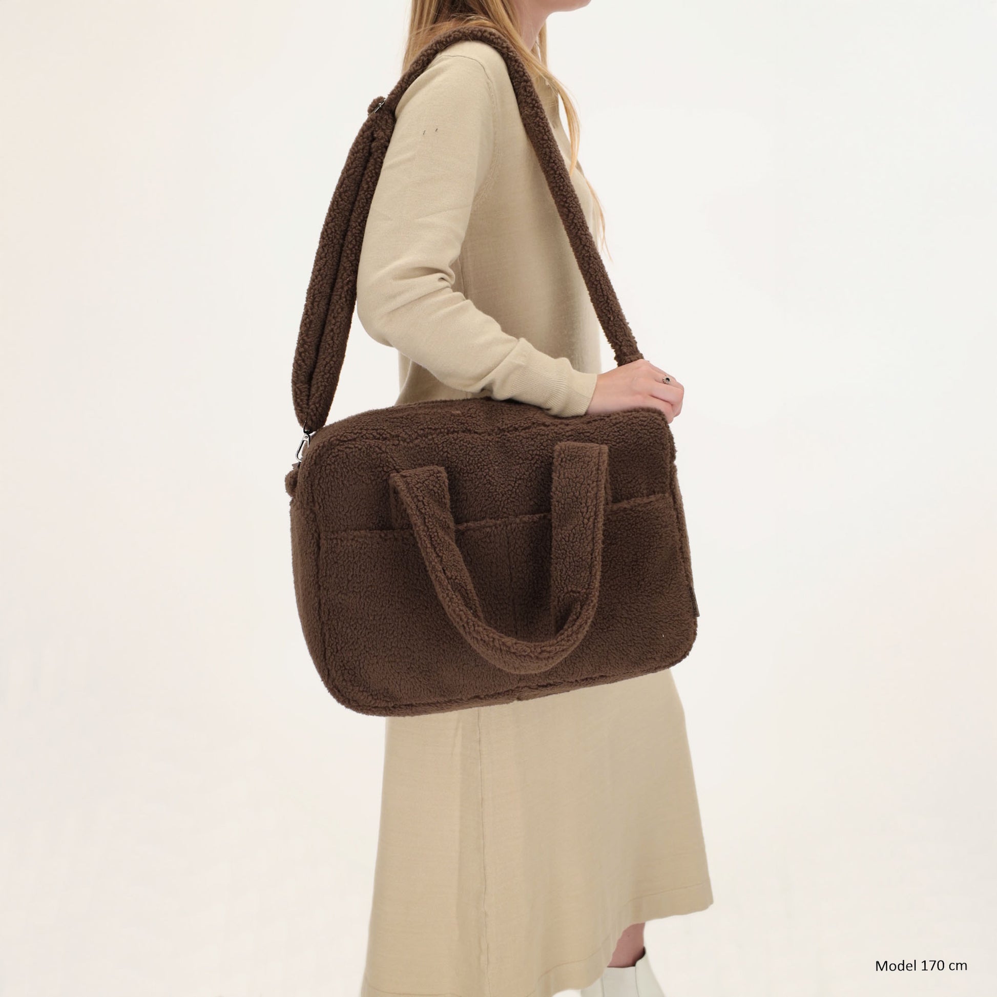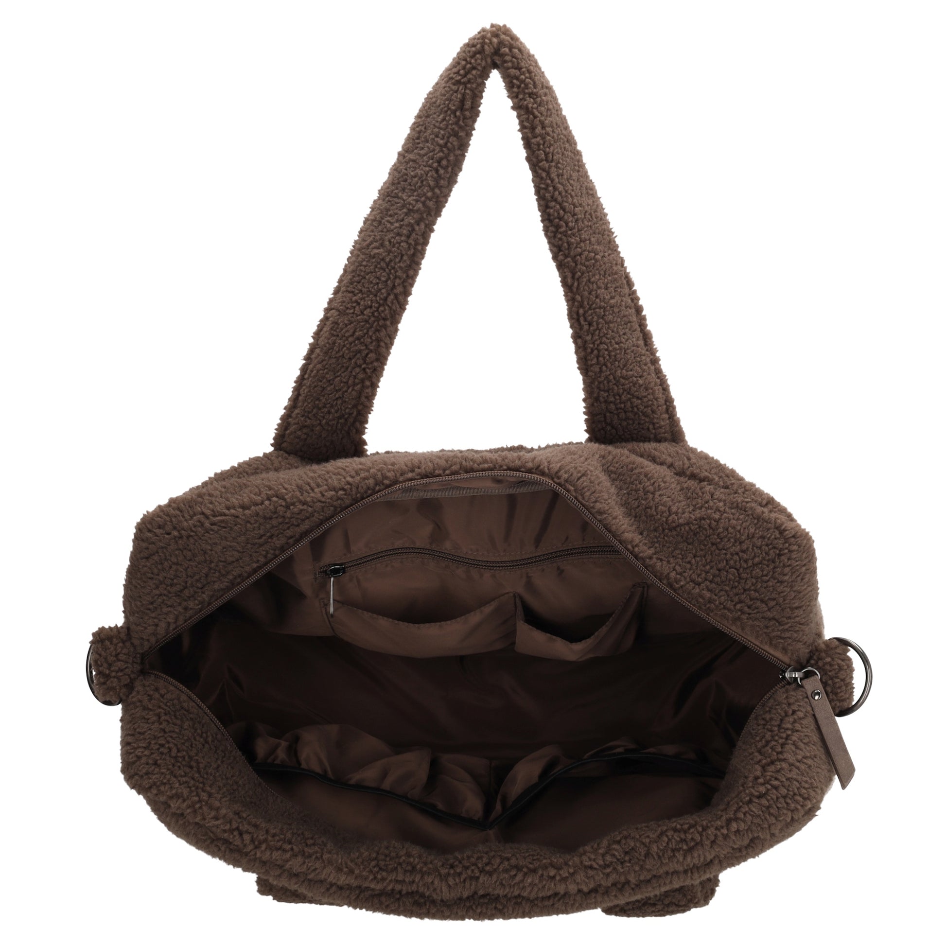 Die braune Teddy-Wickeltasche überzeugt durch ihren warmen, natürlichen Farbton und das kuschelweiche Teddy-Material, das gleichzeitig robust und angenehm zu tragen ist. Sie bietet die perfekte Verbindung aus Stil und Funktion.