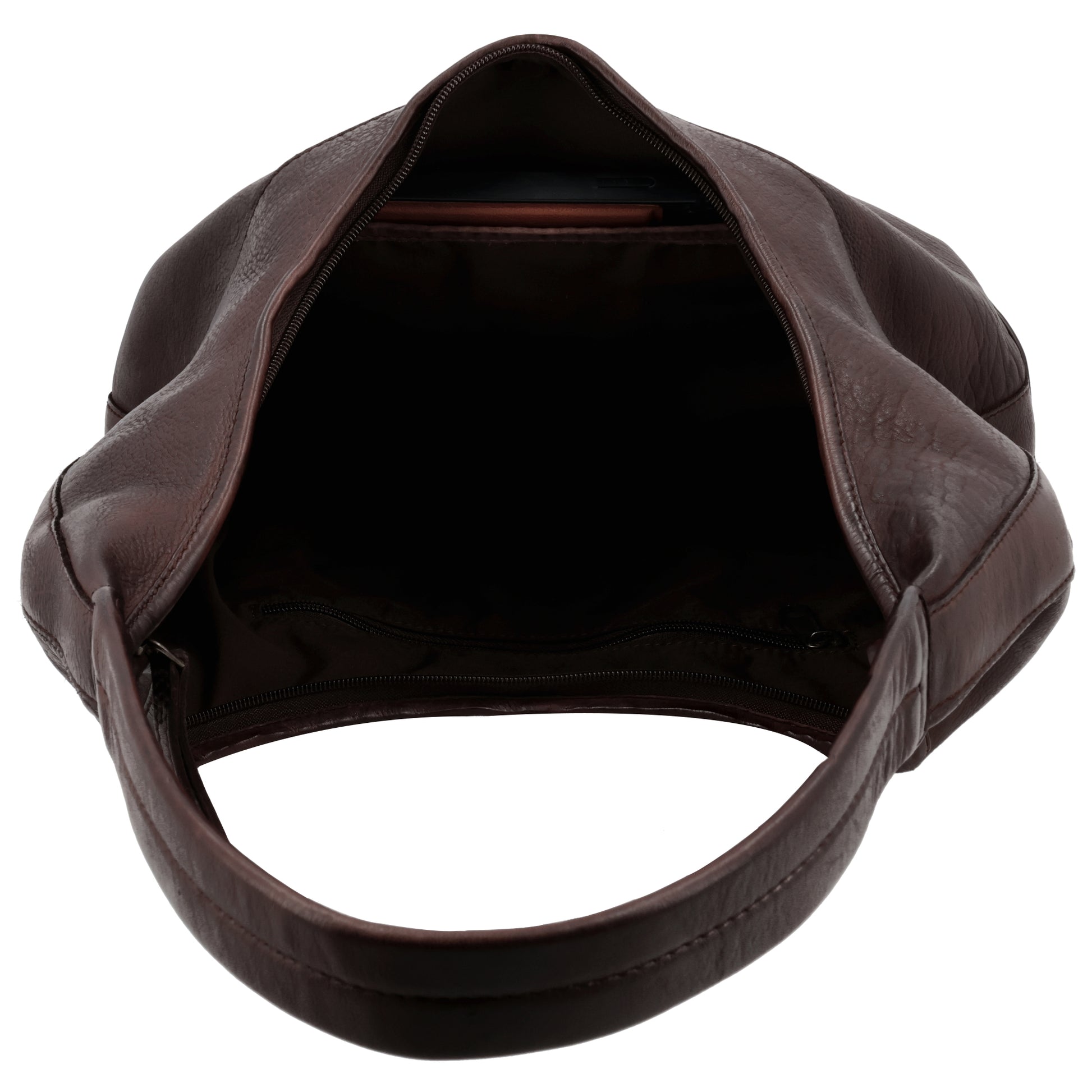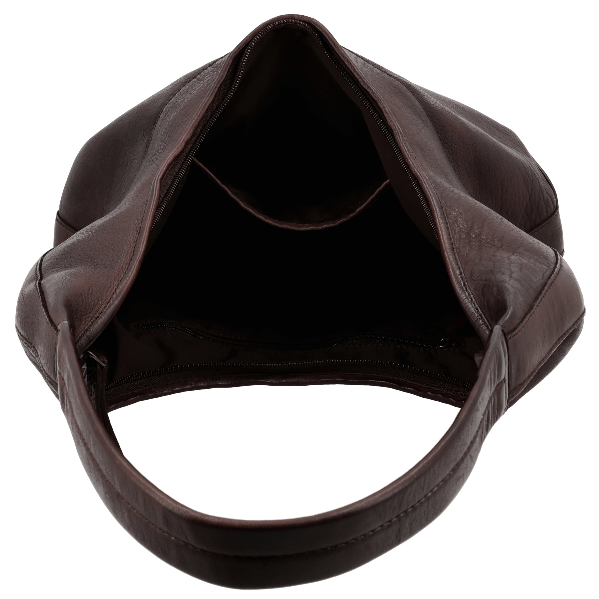Diese hochwertige Umhängetasche im Beutelstil aus echtem Leder vereint stilvolles Design mit alltagstauglicher Funktionalität. In klassischem Dunkelbraun gehalten, ist sie die ideale Begleiterin für Frauen, die Qualität, Komfort und ein zeitloses Design zu schätzen wissen. Mit ihren Maßen von 40 x 40 x 10,5 cm bietet die Tasche ausreichend Stauraum für alle wichtigen Dinge des Alltags – ohne dabei klobig zu wirken.