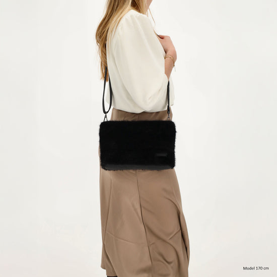 Diese schwarze Umhängetasche aus weichem Kunstfell ist der perfekte Mix aus gemütlichem Winter-Look und urbaner Eleganz. Mit ihrer kompakten Größe und der flauschigen Oberfläche wird sie zum stilvollen Accessoire, das jedem Outfit einen modernen Akzent verleiht – ideal für Herbst und Winter.