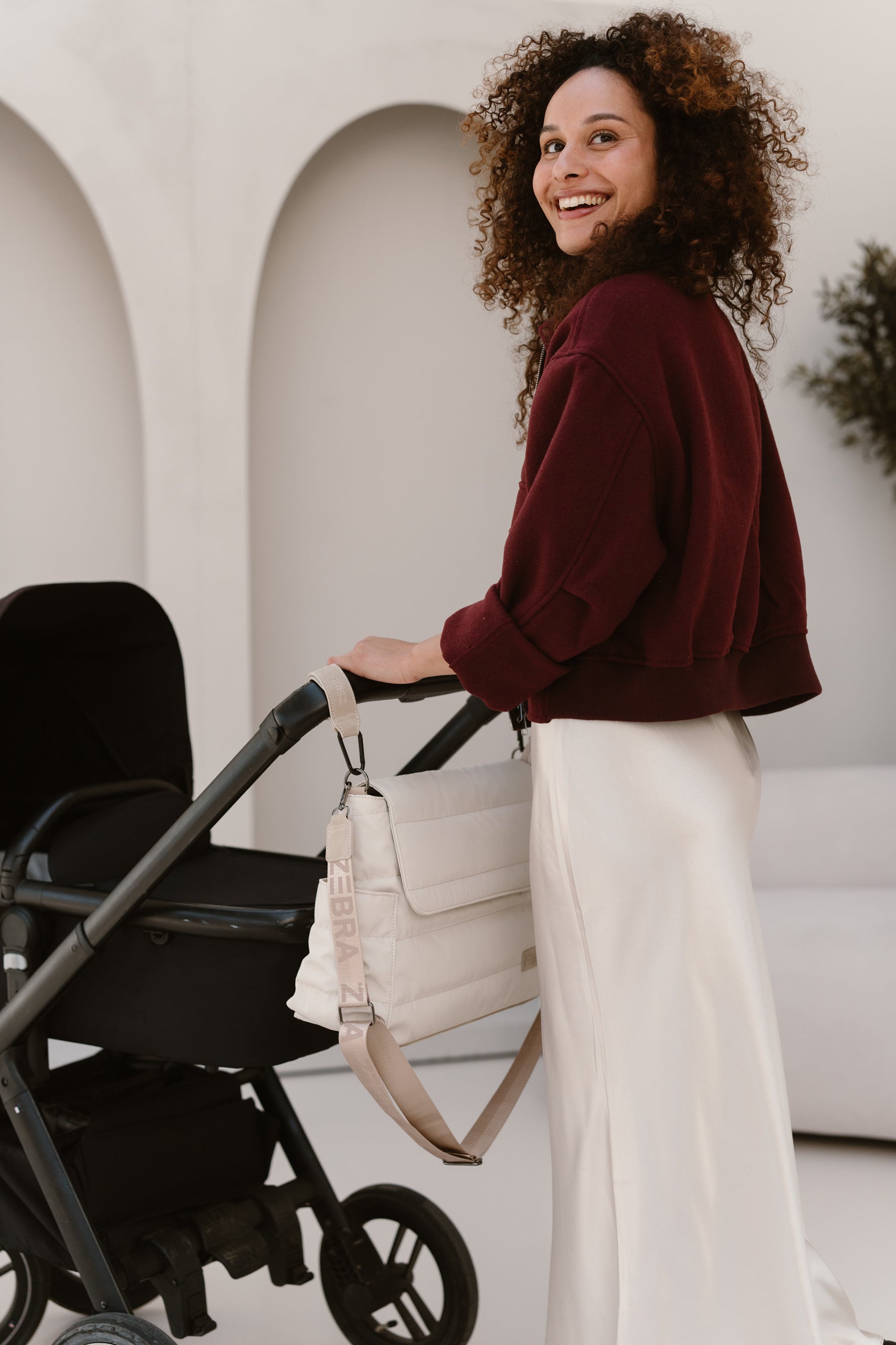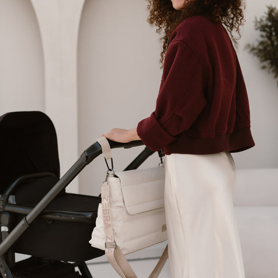 Bequem & flexibel: Breiter, verstellbarer Schultergurt und kurze Schlaufen zur Befestigung am Kinderwagen.