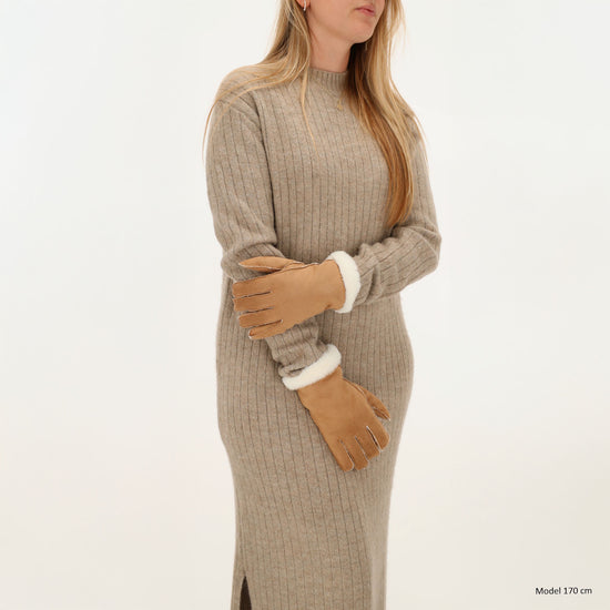 Dank ihrer warmen Farbgebung in Cognac lassen sich die Handschuhe hervorragend mit klassischen und modernen Winteroutfits kombinieren. Das pflegeleichte Material aus 100 % Polyester sieht echtem Wildleder zum Verwechseln ähnlich, ist aber deutlich unkomplizierter im Alltag.